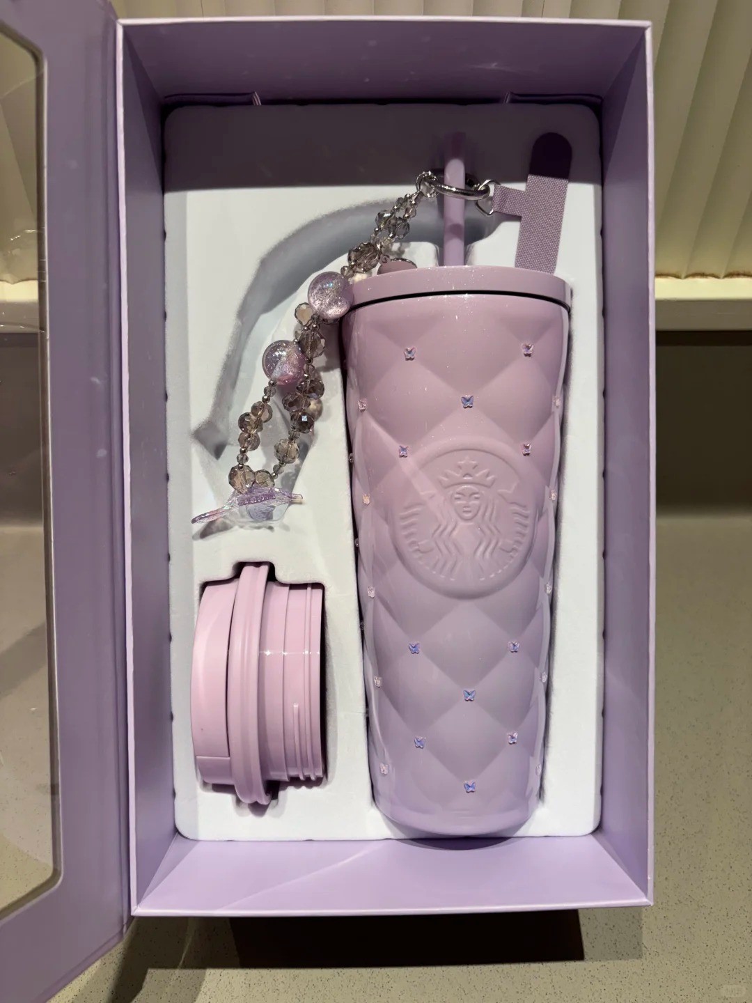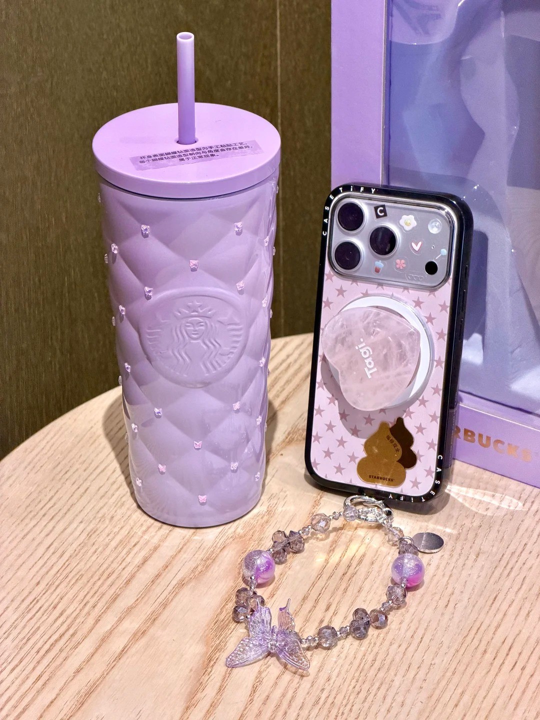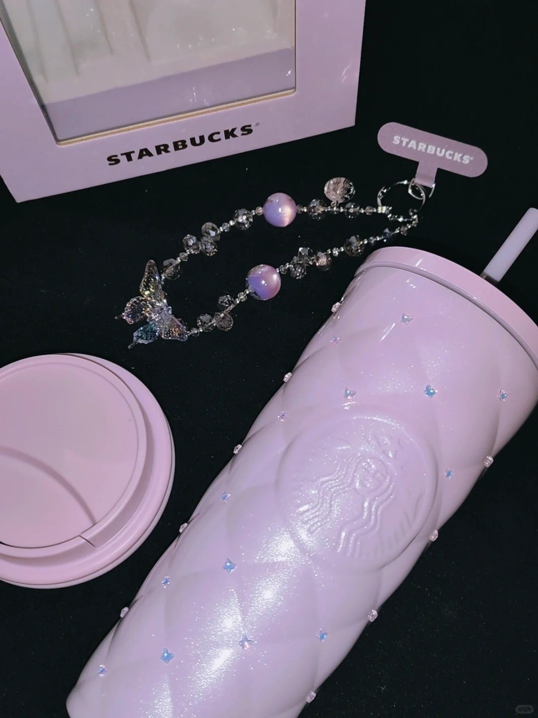 星巴克 暮樱翩翩 菱格纹 蝴蝶钻面 双盖 不锈钢 保温杯 谁懂这个粉紫渐变!