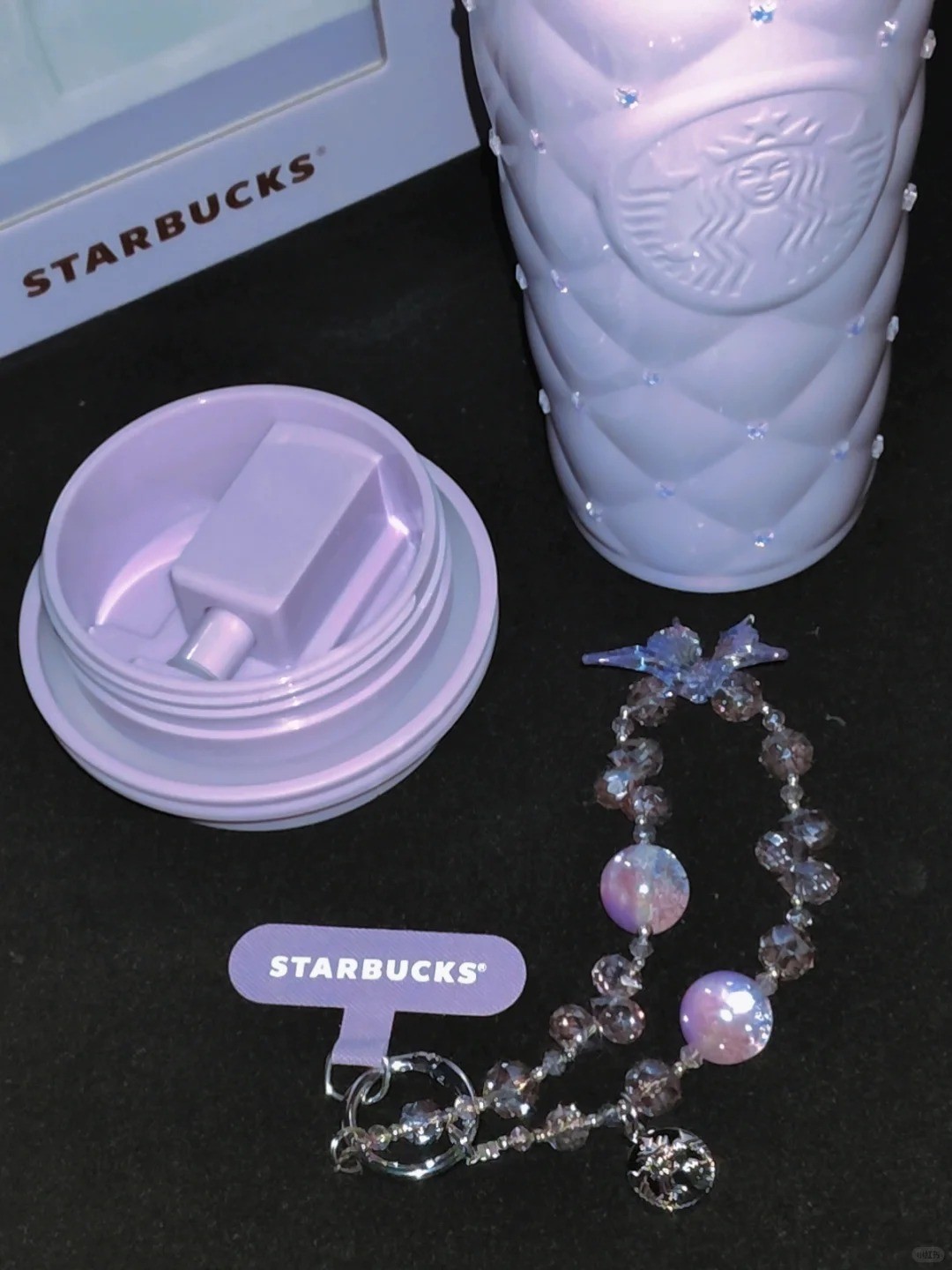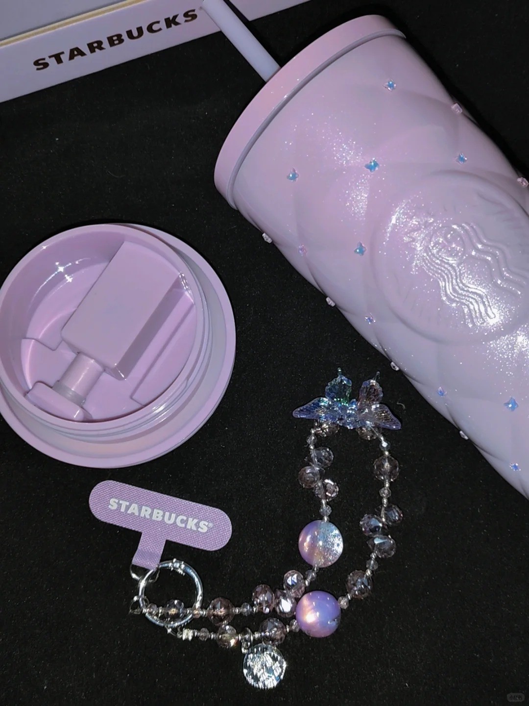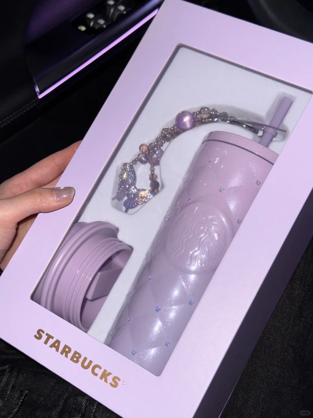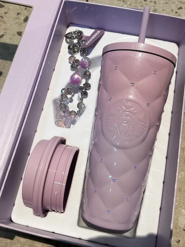 星巴克 暮樱翩翩 菱格纹 蝴蝶钻面 双盖 不锈钢 保温杯 谁懂这个粉紫渐变!