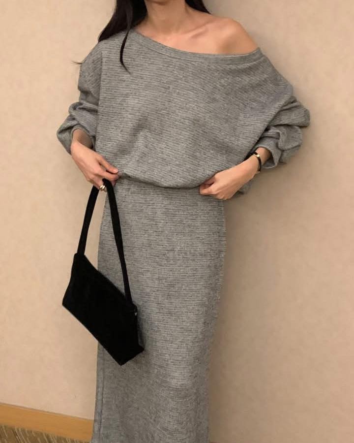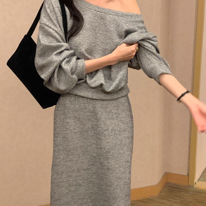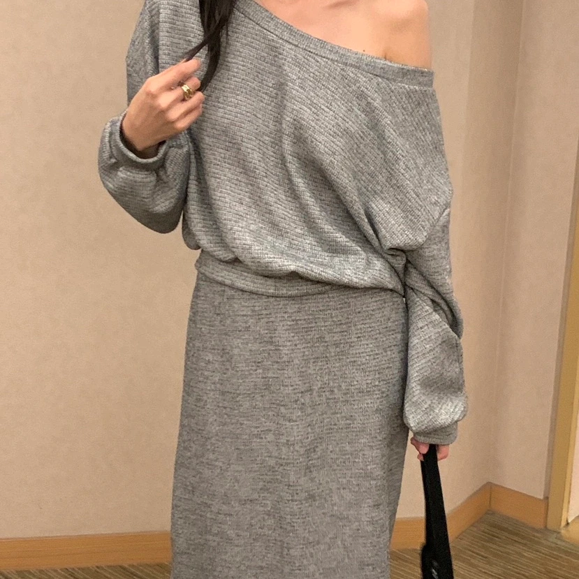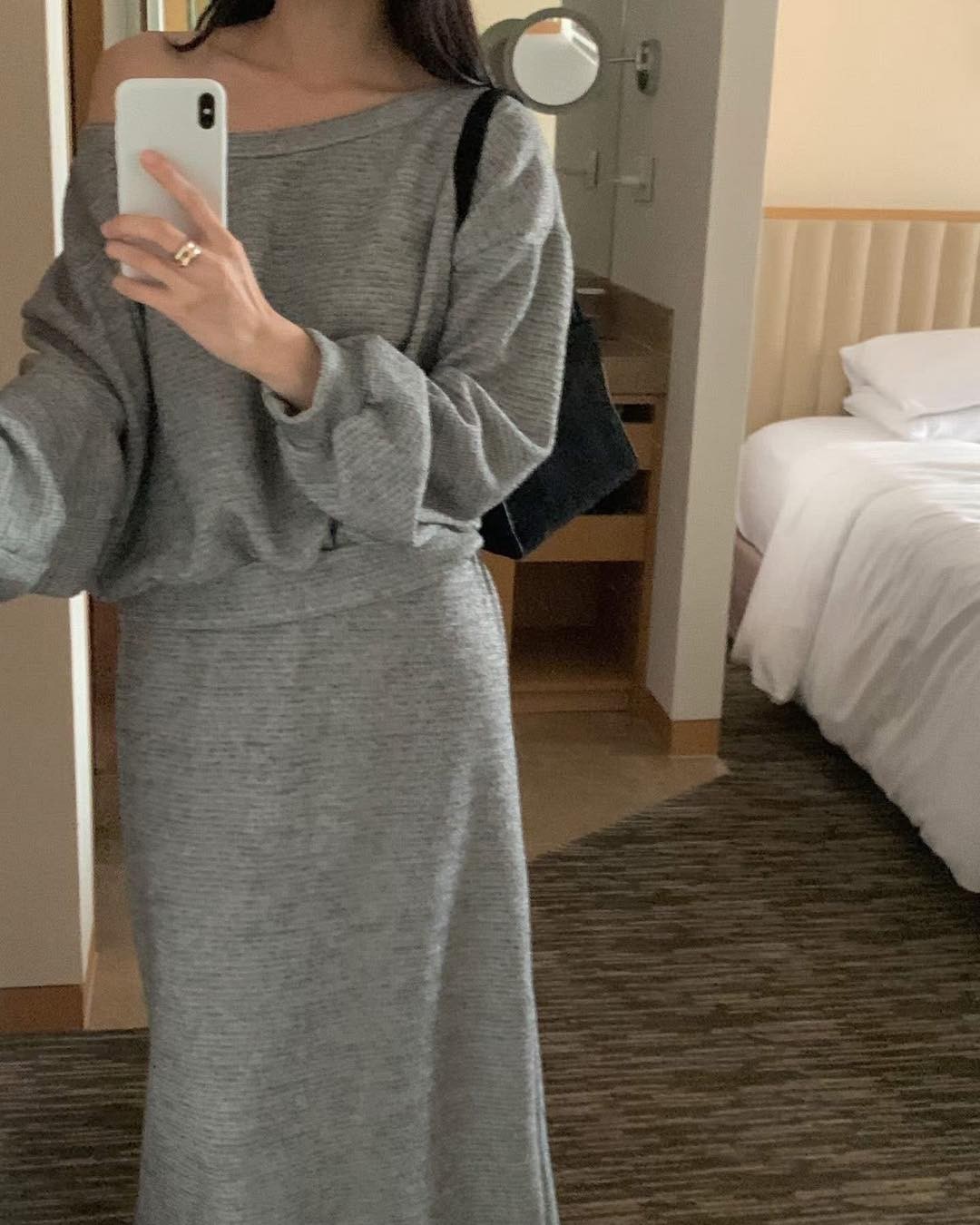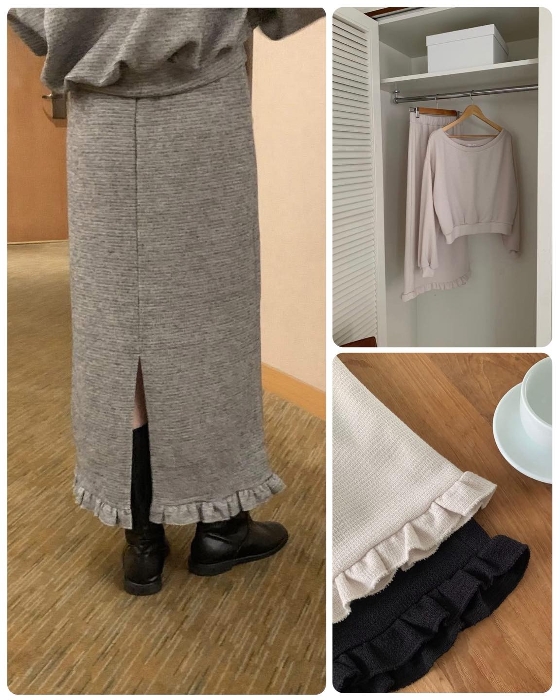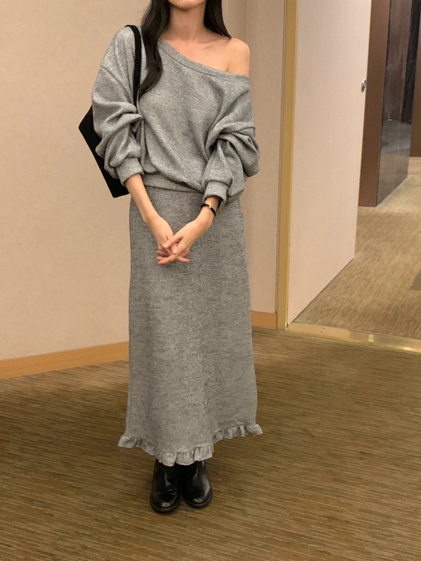 尺寸:平量上衣:肩宽62/胸围62/衣长50裙子:腰围32(松紧)/臀围47/裙长87成分:聚酯纤维+氨纶针织☑ 微露肩剪裁衬托锁骨线条,展现慵懒氛围☑ 荷叶裙摆与开衩细节修饰身形比例☑ 弹性针织面料保暖柔软,秋冬穿搭首选