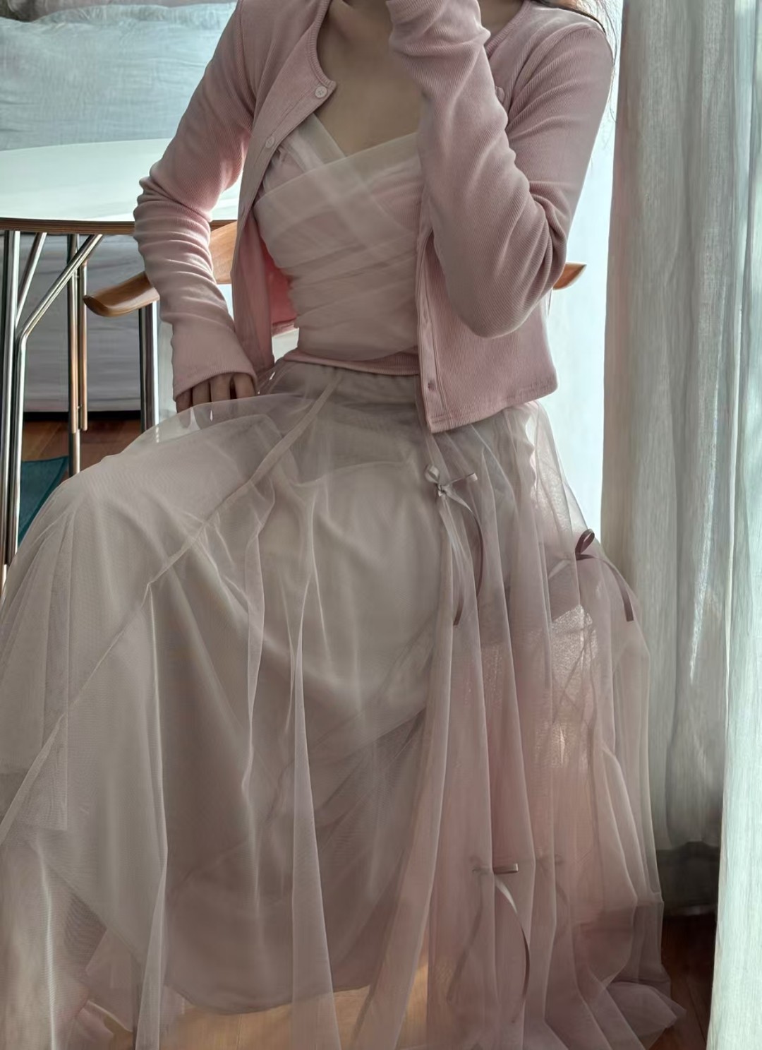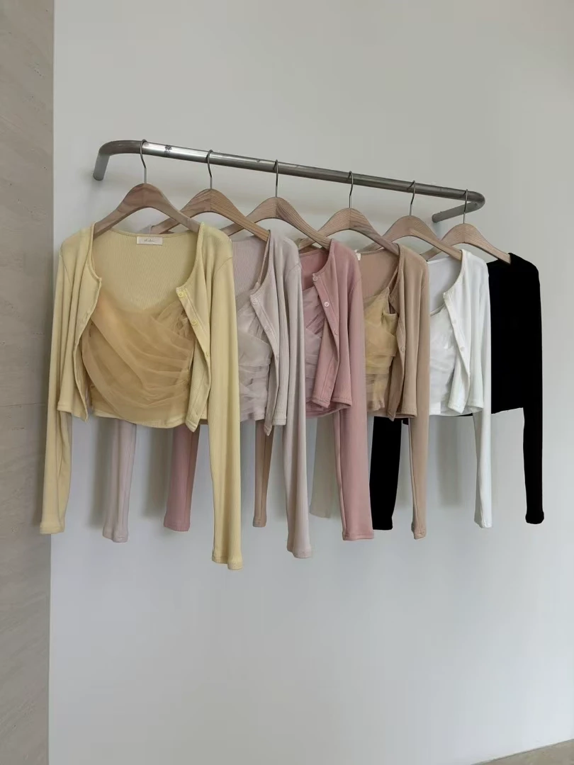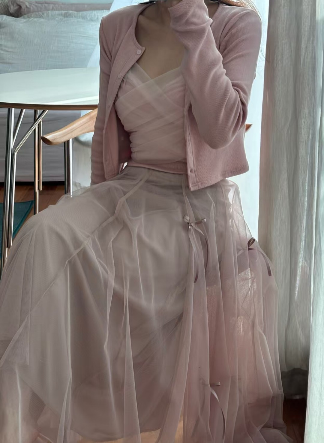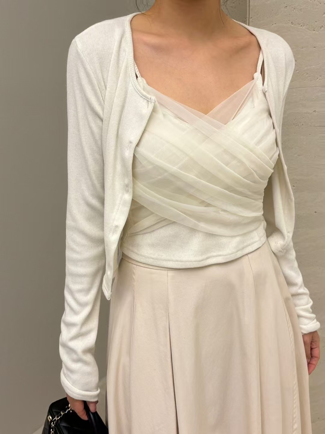 【换季八折】韩国女装 代购交叉网纱蕾丝拼接 吊带 开衫 两件套