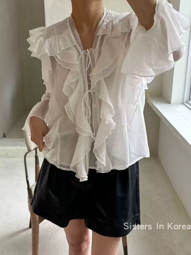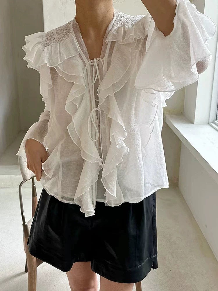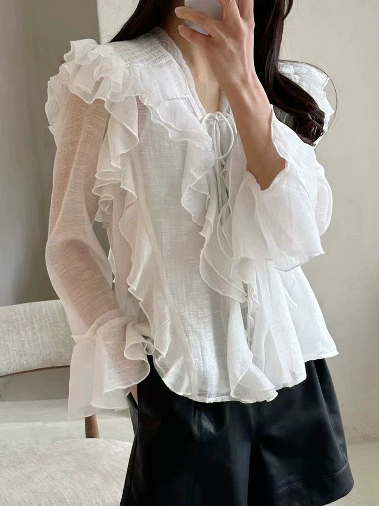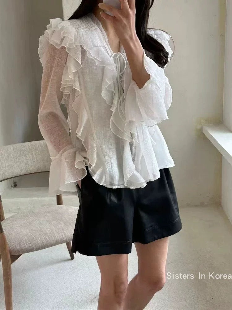 韩国女装 新款木耳边喇叭袖两件式衬衫 (限时7折 加入购物车自动减价)