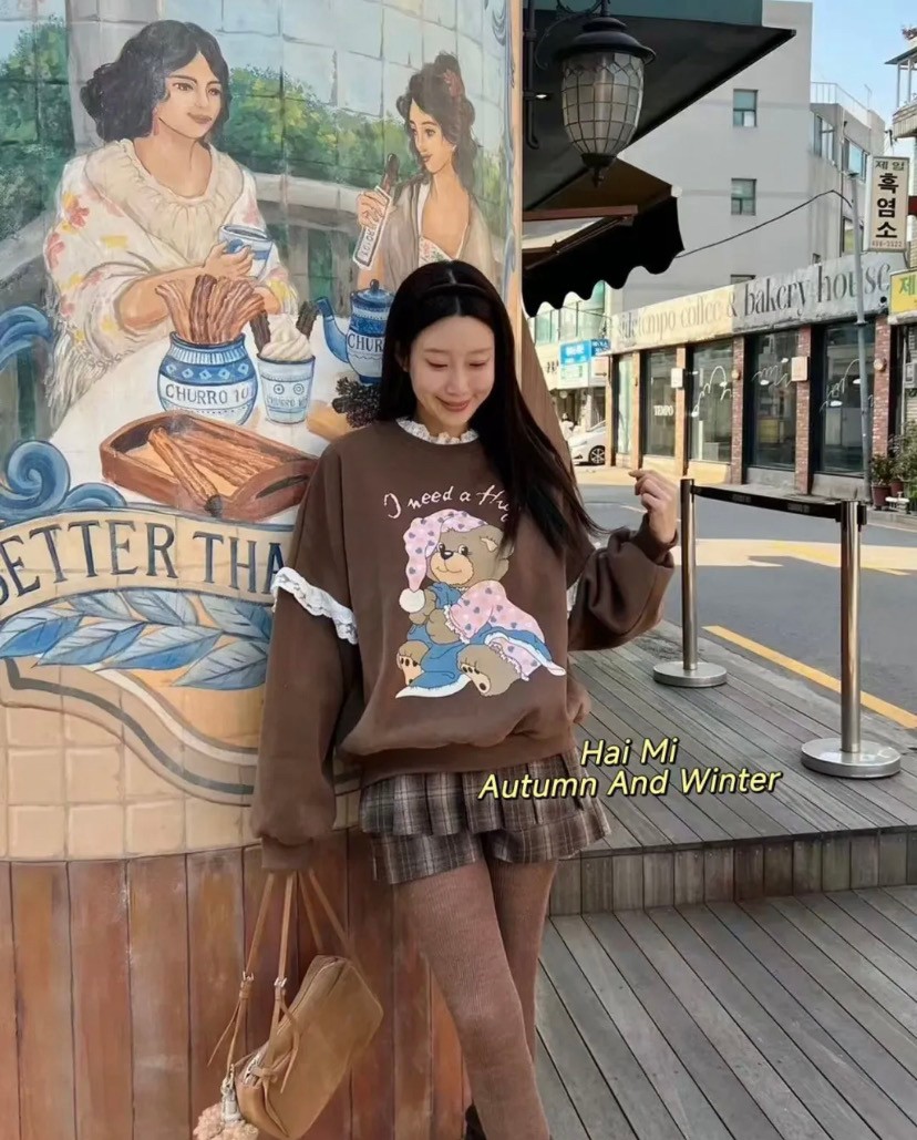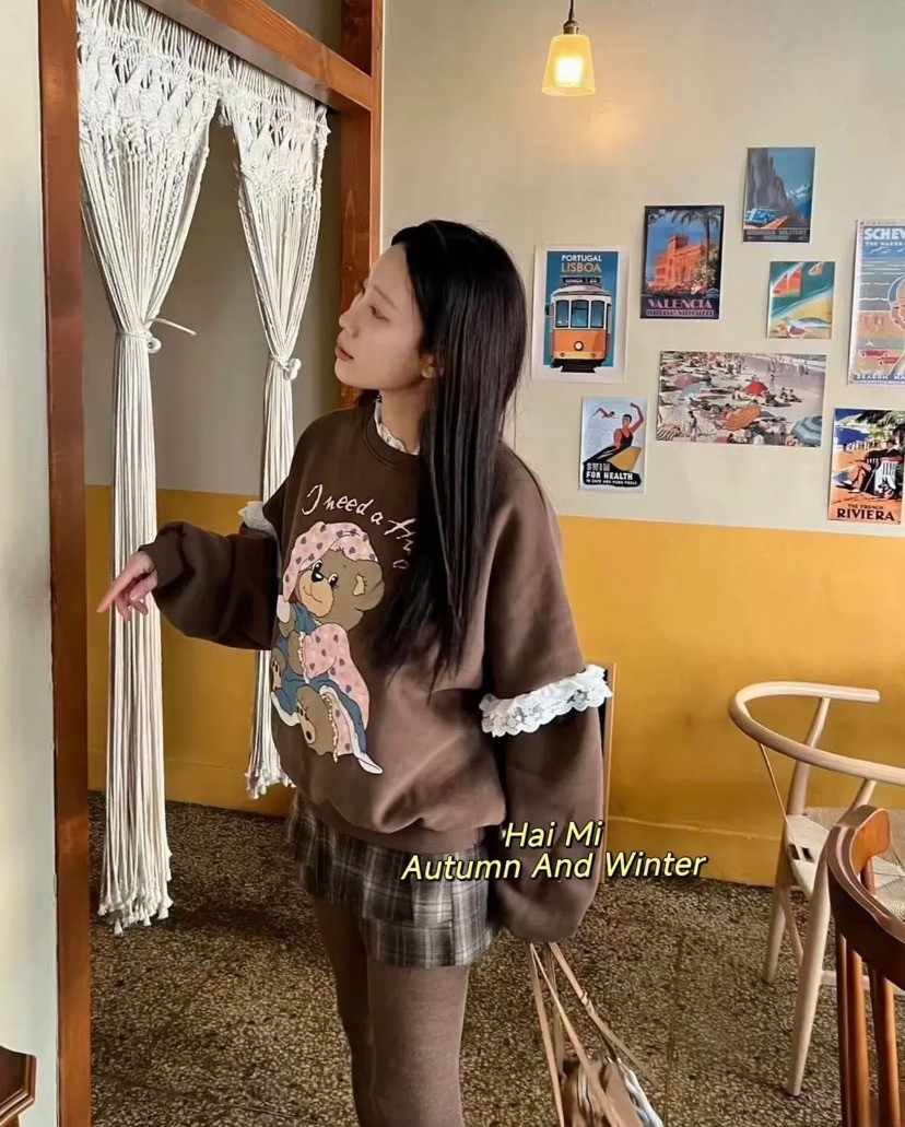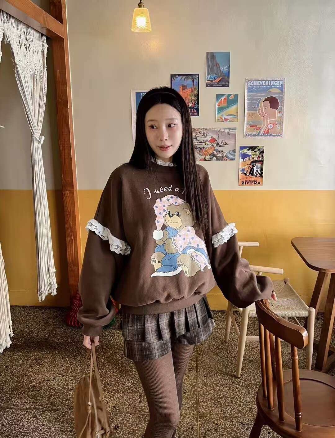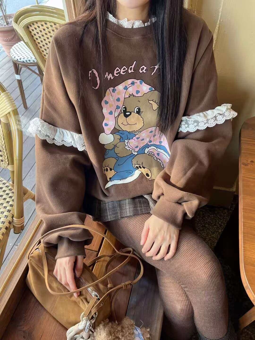 韩国女装 蕾丝花边 小熊 印花 卫衣 胸围150cm长70cm